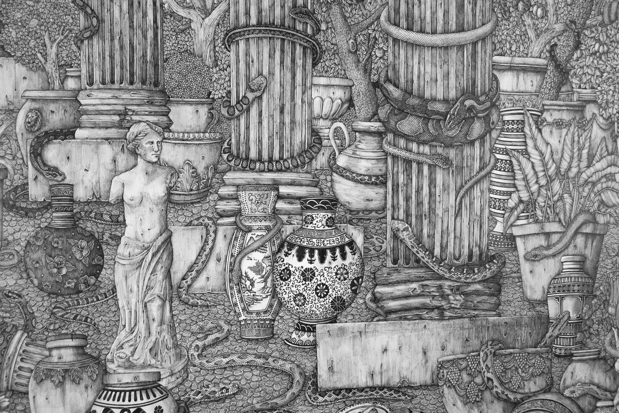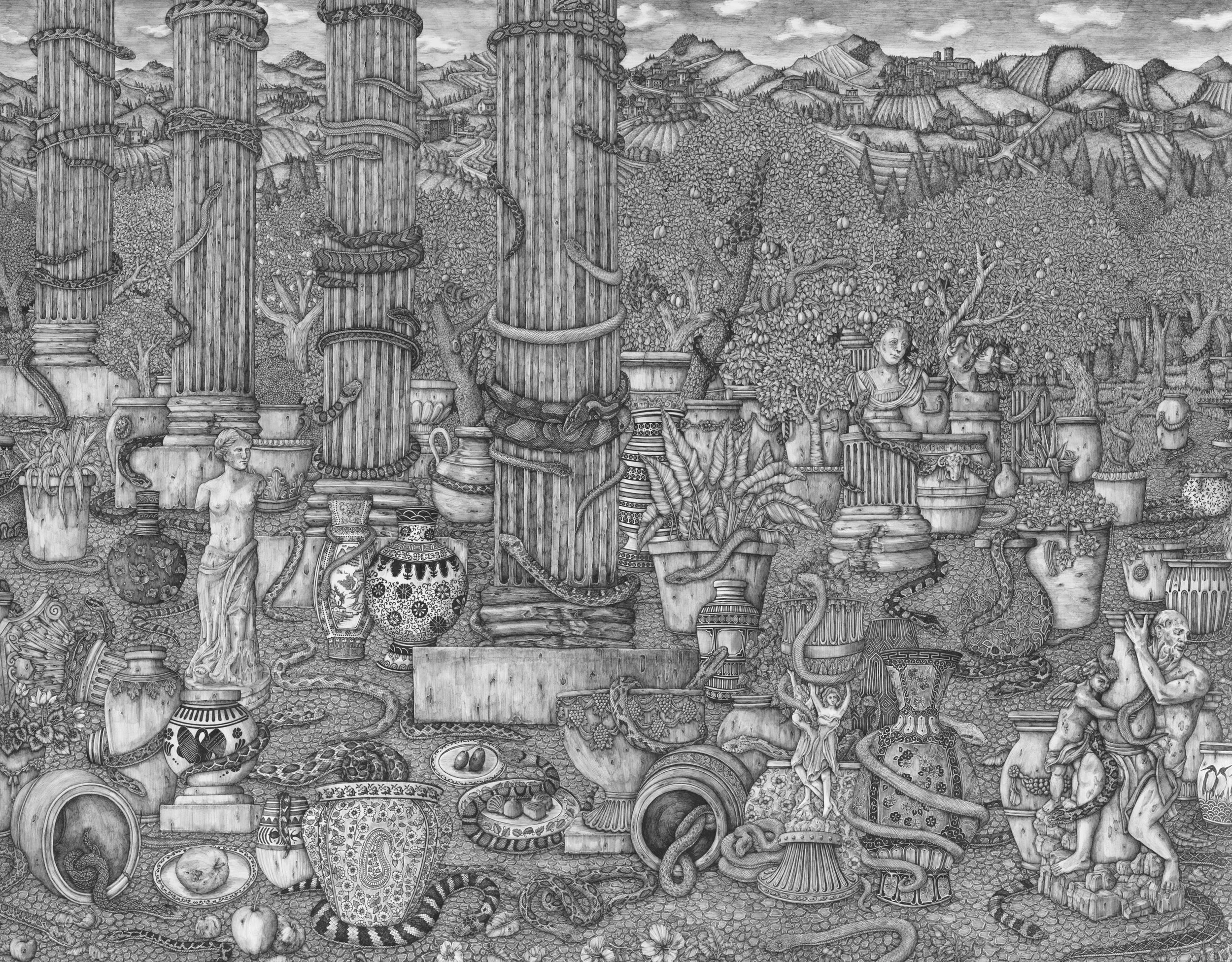 Specializing in pen and ink, Olivia creates intricate, highly detailed works that are often expansive, imagined, and surreal. Her compositions are complex, packed with a multitude of tiny, meticulously rendered details that coalesce into sprawling scenes without a single focal point. Many are based on places Kemp has known, transformed through memory and imagination into something entirely other.
